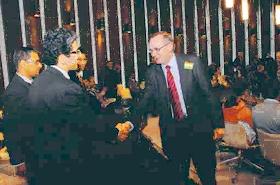 Regionsrådsformand Bent Hansen hilser på én af de indiske læger.