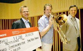 På billedet ses Jesper Busk Sørensen med basun, direktør for Spar Nord Århus, Hans Jørgen Østergaard (med check) samt musikchef ved Aarhus Symfoniorkester, Palle Kjeldgaard.