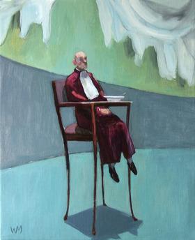 Børn og gamle øver sig i at sidde stille uden stol - svævende i hverdagsrummet. I de høje barnestole sidder gamle mænd, der engang bestemte alt, klædt i dommerkapper med de andres vasketøj vajende over sig.