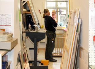 Glarmester Helle Berger fra Midtsjællands Glas i Ringsted har haft datteren Nicoline med på arbejde i barselsorloven.