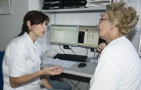 Læge Mette Molly-Søholm i patientsamtale i forbindelse med stuegang på hospitalets hjerteafdeling. (Foto: Region Midt)