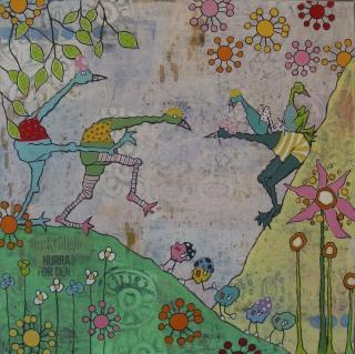 Pia Viborgs malerier er skabt i skrot, papir og ståltråd, og billeder er bygget op i papircollager for derefter at danne bund for det egentlige maleri. Gitte Kalstrups keramiske værker er sjove og fantasifulde. Dem kan man blive fornøjet af at se.