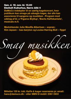2 sangere, 1 flygel, og rigeligt med smør!! - DaMuCo byder pÃ¥ ”musik til eftermiddagskaffen”. Kom og hør en hyggelig eftermiddagskoncert i Kulturministeriet, og nyd din eftermiddagskaffe med et udvalg af skønne kager. - Sopran Julie MeRaa Albertsen og bas-baryton Kim Jepsen akkompagneres af Louise Boll pÃ¥ flygel, i et meget blandet program af opera, tysk lied, nordisk romance og musical. - Fælles for musikken er, at alle satser kan associeres til noget man vil finde pÃ¥ et veldækket kaffebord. SÃ¥ imens der f.eks. synges om franske kejsere og napoleonskrigene, kan man nyde en hjemmebagt napoleonshat. SÃ¥ledes bindes koncerten sammen af den søde tand.