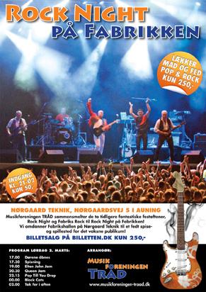 Musik og festaften i Auning for det voksne publikum med spisning og 4 fede live bands. Musikforeningen TRÅD sammensmelter de to populære arrangementer "Rock Night" og "Fabriksrock" til "Rock Night på Fabrikken". Vi omdanner fabrikshallen på Nørgaard Teknik til et fedt spille og spisested for det voksne publikum. God mad og 4 forrygende livebands sørger for en festlig musikalsk aften. Kom og vær med fra starten for kun 250,- incl. mad eller fra kl 21.00 hvor entréen koster blot 50 kr.
