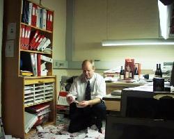 Formand for Kolind Handelsstandsforening, Jørn Schmidt, kravler rundt på gulvet for at få et overblik over de mange indleverede kuponer til dette års julestempelkonkurrence.