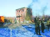 Hjemmeværnsfolk fra Djursland træner værnepligtige i katastrofesituationer. Her udsættes soldaterne for eksplosionsbrande med derpå følgende sluknings- og redningsarbejde.