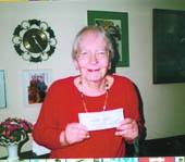 Inger Andreasen fra Grenaa viser glad checken på 10.000 kroner frem, som skal sendes til SOS Børnebyernes hovedkontor i København. Samtidig vil Inger gerne udtrykke sin glæde og taknemmelighed overfor borgerne på Djursland for deres støtte, og den venlighed hun altid møder.