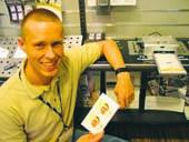 Tobias Thaastrup-Leth fra Sonofon-butikken i Grenaa viser her et billede af sig selv på rigtigt foto-papir. Et billede, der er taget med en mobiltelefon med digitalt kamera, og som så er blevet printet ud på 60 sekunder af den Kodak-printer, som også ses på billedet. Med andre ord hurtig og enkel fotoservice.