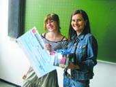 På billedet ses Line idet hun modtager sin præmie fra Trine Glerup Bachmann, der er kunderådgiver i Vivild og Omegns Sparekasses Grenaa Afdeling.