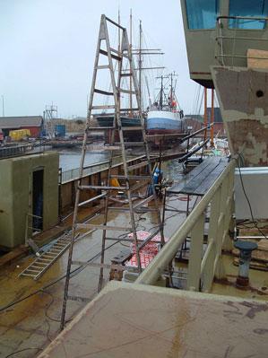 DÃ¥rligt vejr, især store bølger, forsinkede ogsÃ¥ bugseringen fra Rusland op igennem Østersøen og videre til Vesterhavet i Hvide Sande. Senest lÃ¥ færgen i fire dage i Thyborøn, inden den sidste tur til værftet kunne gennemføres.”Â