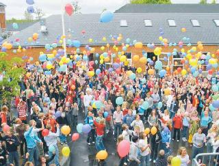 Det hele startede midt på formiddagen, hvor alle elever samledes i festsalen. Efter en velkomst ved skolens inspektør, Finn Mikkelsen, var der fællessang, taler og underholdning ved skolens kor. Lidt over kl. 11.00 hentede eleverne så balloner i deres respektive klasser, hvorefter man samledes i skolegården. Her var der sørget for lidt indvielses-godter i forbindelse med denne opsendelse af balloner. Herefter blev skolen erklæret for indviet. Denne del af programmet blev rundet af med underholdning i gymnastiksalen for SFO-børnene.