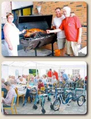 Formand for venneforeningen Svend Busse, køkkenleder Birthe Hansen og slagter fra Slagtehuset kontrollerer om pattegrisen snart kan serveres. - - - De 84 deltagende gæster havde en dejlig sommeraften, hvor man kunne nyde den gode mad og gode harmonikatoner.