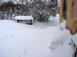 Fra Trustrup forlyder det at selv sneploven er kørt fast, der skulle efter sigende ligge ca. 2 meter driver foran døren til Teknisk Skole og uden for min egen dør ser der ud som på billedet.
