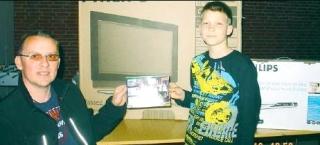 Den heldige vinder Lars Nielsen ses her sammen med sælgeren af loddet - 11-årige Morten Jensen.