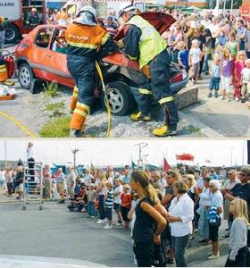 Herstående fotos er taget i forbindelse med den ligeså obligatoriske brand- og redningsøvelse ved Beredskabsgården og Falck. De lokale brandfolk og Falck demonstrerede således deres færdigheder i forbindelse med brand- og redningsarbejde ved en bilbrand, en trafikulykke med fastklemte personer og en brand i en fiskerkutter. Det hele blev på kompetent og veloplagt vis præsenteret og kommenteret af beredskabschef Erik Laursen. Og som det fremgår af begge billeder var der masser af mennesker på Grenaa Havn i lørdags.