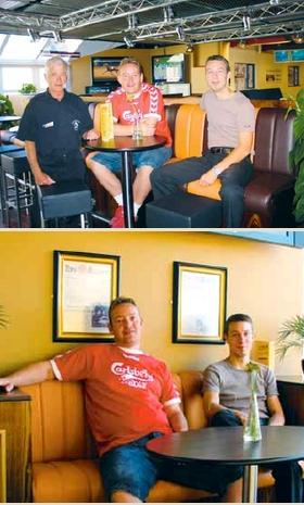 [billede øverst] Tre af dem, der har ansvaret for aktiviteterne i den nyrenoverede sportsbar i Østerbrogade. Fra venstre travekspert Bent Sørensen, indehaveren Glenn Simonsen og førstemand Michael Jul.