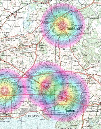 Fordi jeg siger næsten, er det fordi lokale forhold kan give problemer, på den anden side kan der også være betydelig bedre dækning end vist. Det kommer helt an på om der er frit sigt til by-antennen.