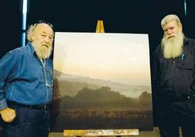 Fotograf Poul Ib Henriksen (tv.) og billedkunstner Ingvar Cronhammar (th.) har sammen med forfatter Peter Laugesen lavet en kunstplakat, der sætter ord og billeder på Midtjylland og som er blevet et meget konkret resultat af regionens arbejde med de midtjyske kunstnere. Foto: Flemming Jeppesen/Fokus Foto.