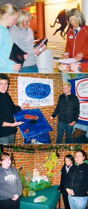 [øverst] På billedet besøger nogle elever Kvickly/Coop Danmarks stand. [midten] HG 1. års-eleverne Anders Overgaard (t.v.) fra Ebeltoft og Brian Byg fra Grenaa havde i forbindelse med tema-ugen på Grenaa Handelsskole lavet denne stand. Deres projekt handlede om rent vand - det være sig både drikkevand og havmiljø. [nederst] Mette Marschall, Mirja Johansen og Rebekka Carlsen havde lavet en hel lille regnskov ud af deres stand.