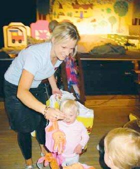 Den arrangerende dagplejegruppe sørgede blandt andet for at opføre teaterstykket »Guldlok og de tre bjørne«. Her ses hovedpersonen »Guldlok« i aktion på scenen i Pavillonsalen i Kulturhuset Pavillonen.