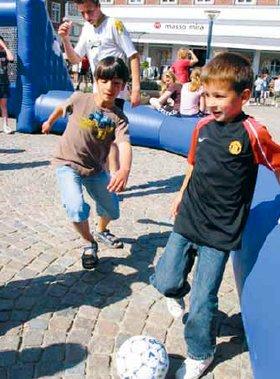 Årgangen sørgede nemlig for oppustelige fodboldbaner og gymnastik for de små årgange på Torvet i Grenaa mandag i sidste uge, og det skal siges, at der blev gået til den - selv om underlaget nok ikke kan kaldes for optimalt. Det kunne således godt gøre lidt ondt at ryge på r.... - men det så nu ikke ud til at virke hæmmende på spillet. Der blev med andre ord gået til vaflerne, og alle så ud til at have det sjovt. Dette tilbud om motion på Torvet var blot ét blandt mange, mange andre - spredt ud over hele den nye storkommune. Sundhedsugens program rummede over 100 forskellige sundheds-aktiviteter, og strakte sig fra den 31. maj til søndag den 8. juni. De sidste punkter på programmet var Fjellerup-marchen og en lokal udgave af den landsdækkende Store Cykeldag. Med udgangspunkt fra Grenaa Naturskole cyklede man i roligt tempo på oplevelses-tur her på det østlige Djursland.