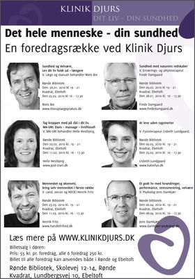 Behandlere fra Klinik Djurs tilbyder i løbet af vinteren og foråret en række foredrag/miniworkshops under overskriften "Det hele mennesker - din sundhed".