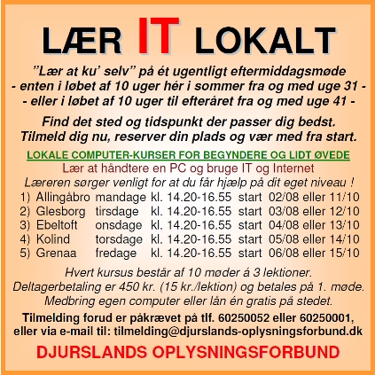 Tilmelding skal ske nu til sommerens lokale kurser i at lære at bruge computer, IT og Internet, enten i Allingåbro, Ebeltoft, Glesborg, Grenaa eller Kolind.