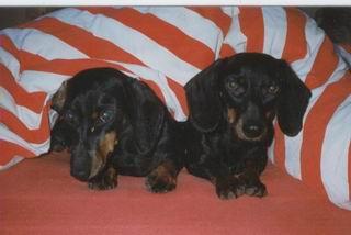 et billede af de to kære væsener. Da de sporløst forsvundne små gravhunde fra Sangstrup endnu ikke er dukket op, har vi lånt et billede hos ejerne, Toni og Poul Møller, Hjembækvej 54, Sangstrup, tlf. 86 33 23 04.