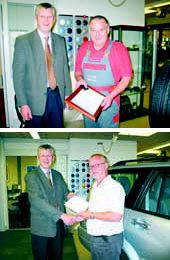 Der var torsdag i sidste uge diplom og gave til automekaniker Knud Erik Jensen for 25 års tro og dygtig tjeneste hos Grenaa Bil-Center A/S. Chefen, Poul Erik Sørensen, kunne samme dag fejre et lignende jubilæum som selvstændig autoforhandler i Grenaa.