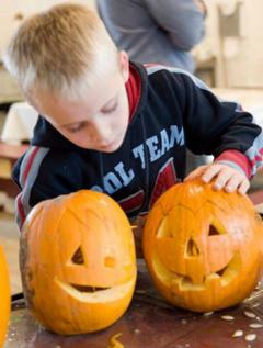 Børn får udleveret et græskar, som de herefter frit kan skære ud som de vil. Medbring selv en kniv. Der serveres boller og kakao til børnene.