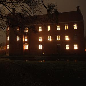 Herregården er denne aften oplyst af hundredevis af levende lys, og arrangementet afsluttes traditionen tro med fakkeltog.