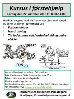 Førstehjælpskurset afholdes af en erfaren Falck-redder. Du lærer hvad kan du gøre, indtil der kommer professionel hjælp ? - Du bliver undervist i førstehjælp ved forbrændinger, nærdrukning og håndtering af tilskadekomne ved færdelsesuheld og andre ulykker. Medbring selv frokost. Prisen på 75 kr. (dog kun 50 kr. for medlemmer) inkluderer formiddagskaffe.