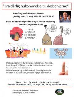 Kulturhuset Helgenæs Præstegård åbner dørene for foredraget "Fra dårlig hukommelse til Klæbehjerne" ved Ole Kiaer Larsen. - Hvad er hemmeligheden bag at huske navne og HVORFOR glemmer vi ? - Disse spørgsmål vil du få svar på i Ole Larsens foredrag, hvor du også vil få tips til enkle husketeknikker, som du kan anvende med det samme. I dette lærerige og underholdende foredrag lærer du kunsten at huske navne, ansigter, vigtige pointer m.m. - Entré: 100 kr. - Dog kun 75 kr. for medlemmer. Entreen inkluderer kaffe, te, kage. Øl, vin og vand kan købes.