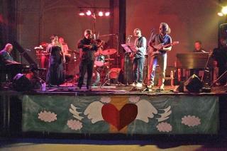 Djursland Spillemænd med det karakteristiske flyvende hjerte på scenetæppet i Den Grå Hal på Christiania.