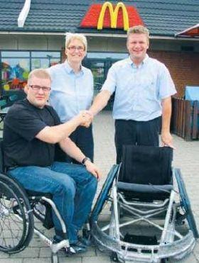 Jens Holst siger tak for sponsorbidraget til en ny rugby-kørestol. Takken er rettet mod Dorthe Ditlevsen og Kenneth Larsen fra McDonalds i Grenaa.