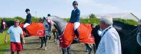 På billedet i midten ses distriktsmester for Young Riders, Mettine Blach på Lano B med det flotte røde dækken sponsoreret af Dansk Rideforbund.