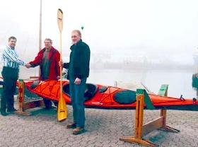 Grenaa Roklubs nye hajkajak er sponsoreret af Kim Olesen fra Davai Cykel- og Marinecenter. På billedet siger formand Freddy Rasmussen og kajakformand Jesper Böttcher tak for den flotte gave.