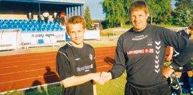Venstre back på Grenaa IF's Danmarksseriehold, Marc Maze, fik ved trænertræffet på Grenaa Stadion lejlighed til at hilse på sin nye træner fra efterårssæsonen - Kent Nielsen fra AC Horsens. Talentfulde Marc Maze har som bekendt skrevet kontrakt med Superliga-klubben, hvor han tiltræder efter sommerferien. Han er 19 år og går på Hessel Gods Fodboldkostskole. (Foto: Mogens Q. Sloth)