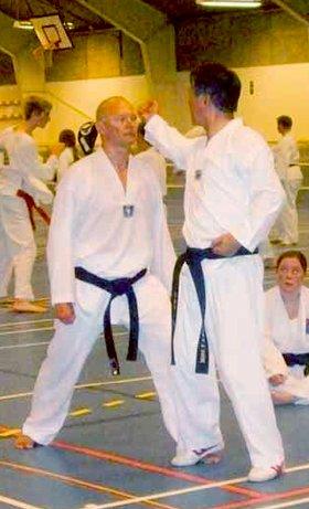 Master Shin Boo-Young viser en taekwondo-teknik for Ole Knudsen ved træningslejren i Mols Hallen i Knebel. (Foto: Hanne Mogensen, Glesborg).